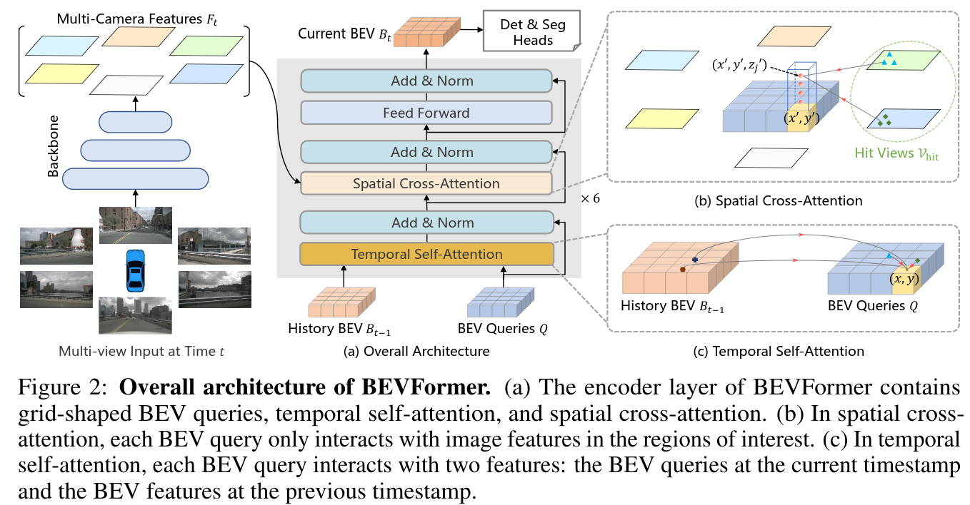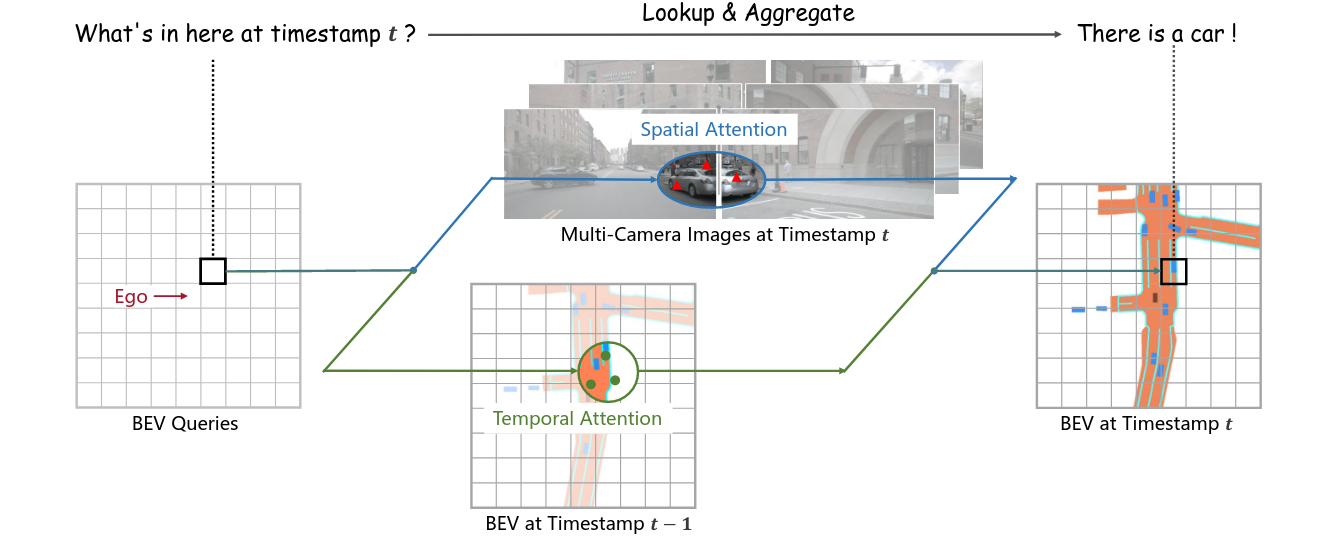 The network’s core representation is in BEV view (BEV query), it uses temporal self attention + spatial cross attention. The author states that they are inspired by Tesla’s video spatial transformer.
