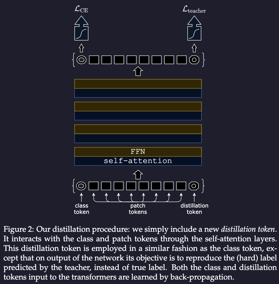 Recall that in classic classifier ViT structure, we’ve got a class token as the first one in the input and we use the output as the “real output”. We can add another similar one, call it “distillation token”, which is very similar as the class one, except the training object is given by the distillation component of the loss. That means we are learn each of its component individually.