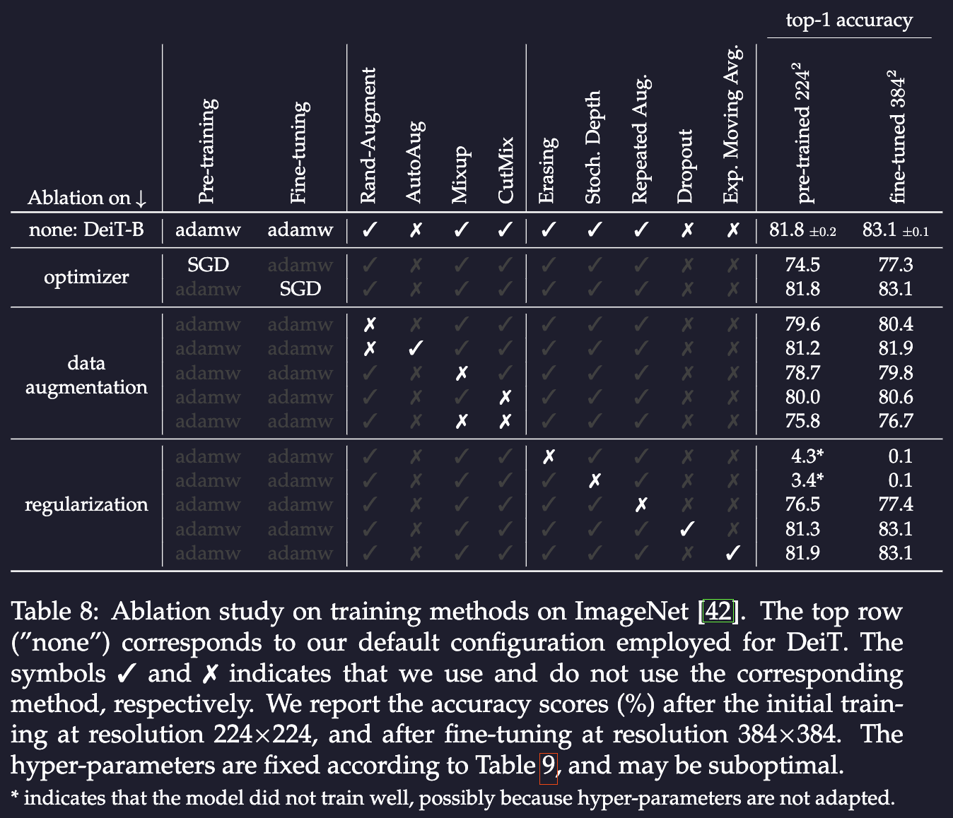 almost all the data-augmentation methods that we evaluate prove to be useful. One exception is dropout, which we exclude from our training procedure. deit, page 15