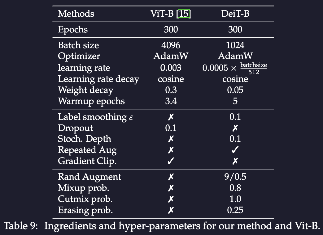 - Train a ViT fast and data efficient. This is done mostly through hyperparameter change and data augmentation method.