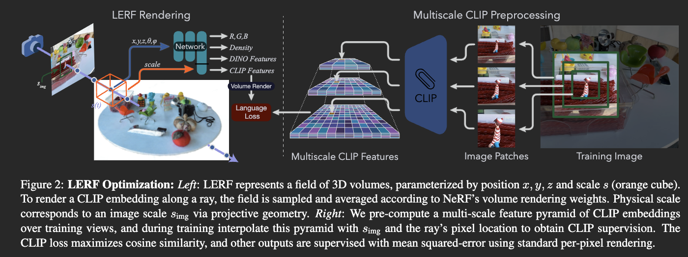 Recall in NeRF the input is position and view direction . For text embedding, in addition to that along the ray, we also take scale as an input. It’s basically a frustum along the ray. The integration works just as before: we not only can integrate color, we can also integrate whatever embedding we want. So in this case, for each sampled point, we just come up with some embedding, volume render it, then compare with the ground truth.