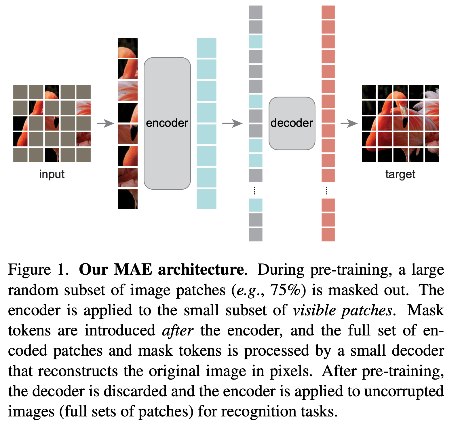 - We only encode the non-masked pixels. this saves compute, and get better results. That’s because in evaluation / deploy time we never see that mask. So in training time we should not let encoder see it either.