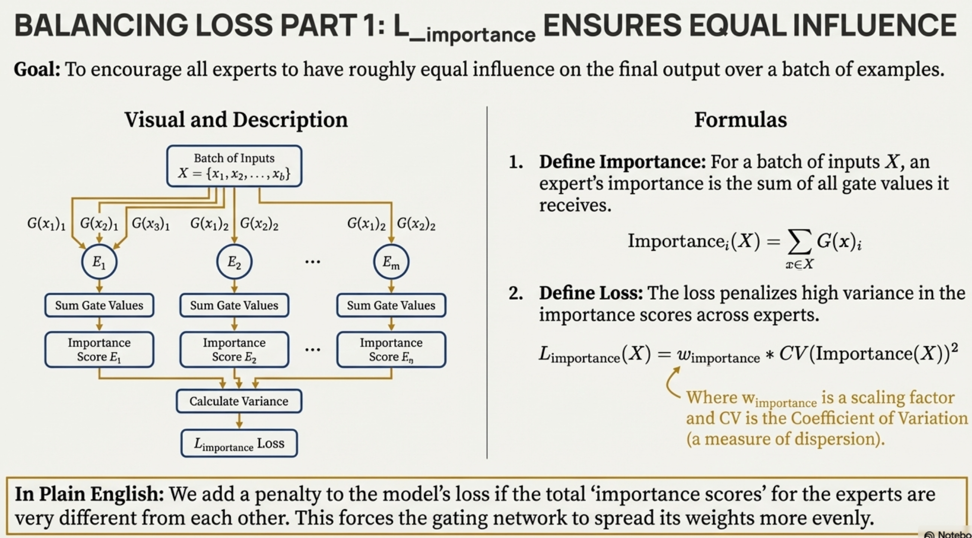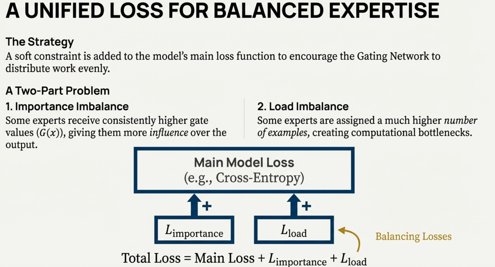 for load-balancing purposes, we want to define an additional loss function to encourage experts to receive roughly equal numbers of training examples. Unfortunately, the number of examples received by an expert is a discrete quantity, so it can not be used in backpropagation.