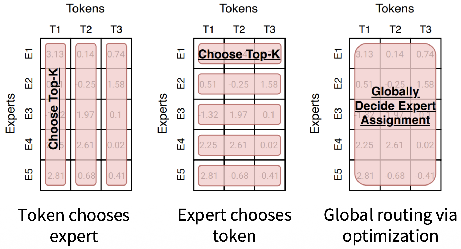 Each token selects top- experts from its row of . Guarantees every token is processed by exactly experts. Downside: requires auxiliary load-balancing loss or capacity buffers to avoid expert collapse.