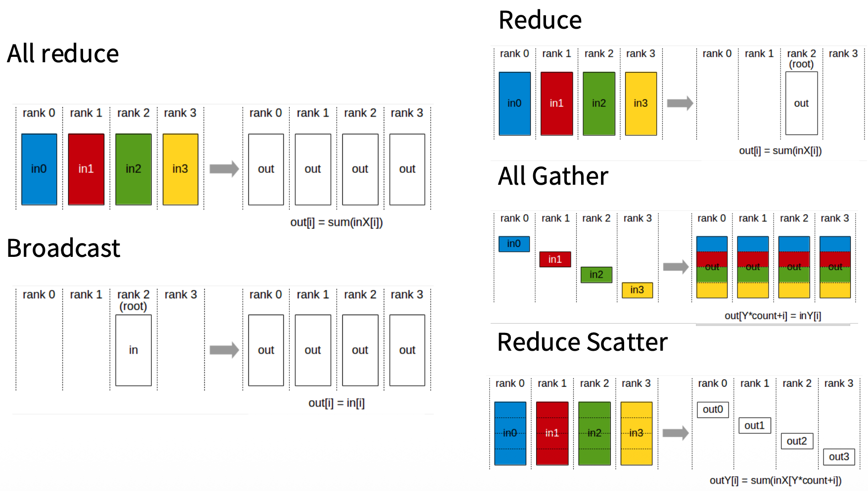 Every rank starts with a local tensor (e.g. gradients). The goal is for every rank to end up with the elementwise sum across all ranks — without any single node being a bottleneck.