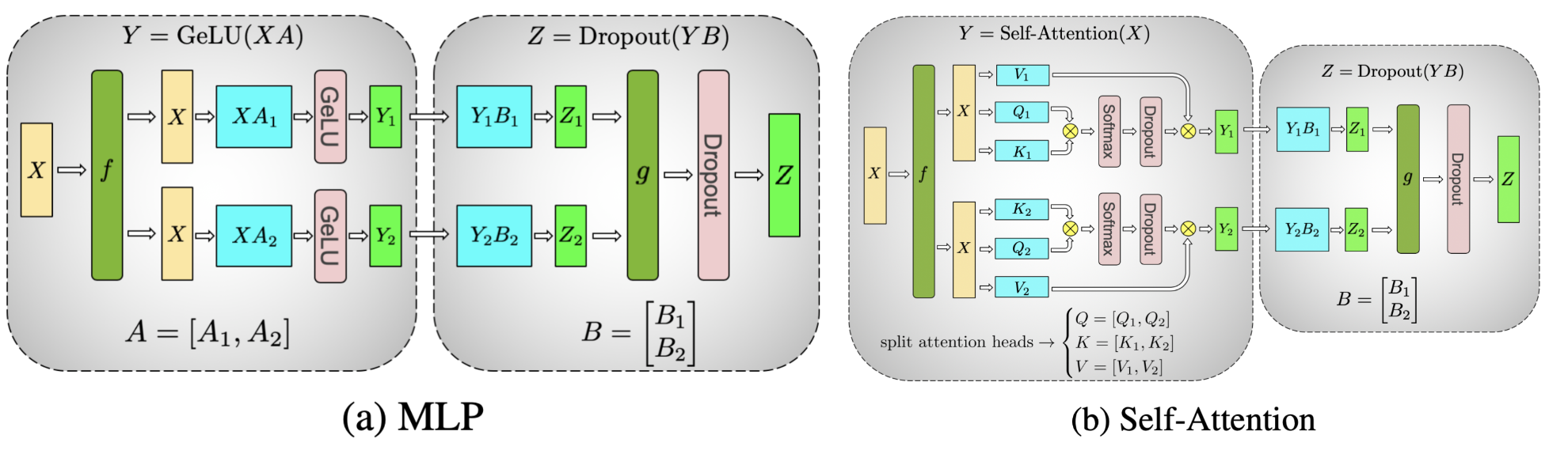 - In the forward pass, f is the identity, and g is an all-reduce.