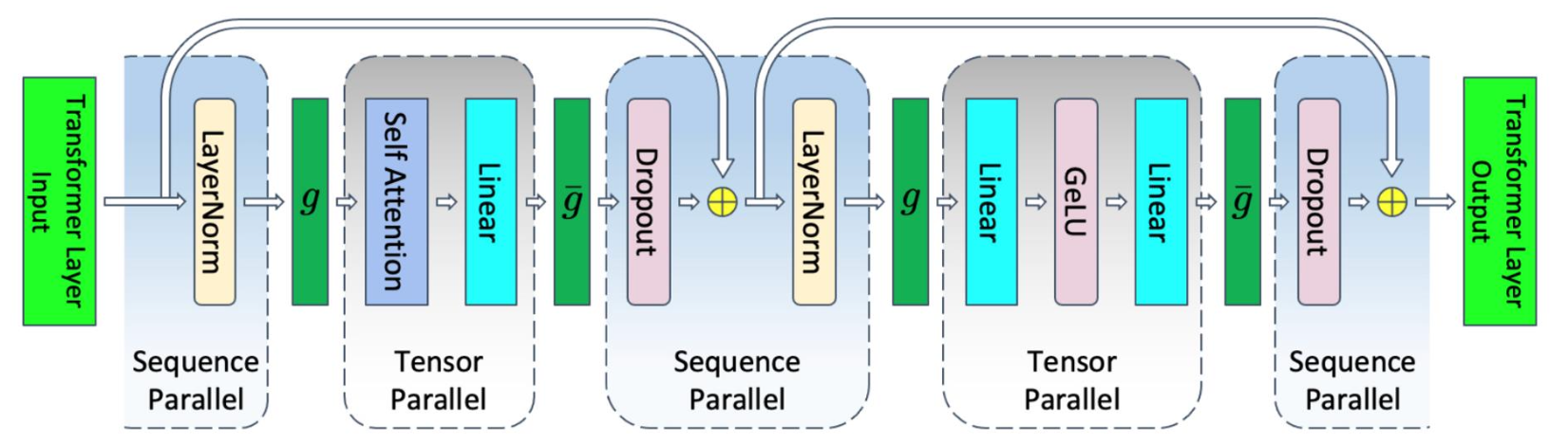 | Tensor+seq | 2x transformer block | Linear | 8*activations per-layer all-reduce | No impact | No |