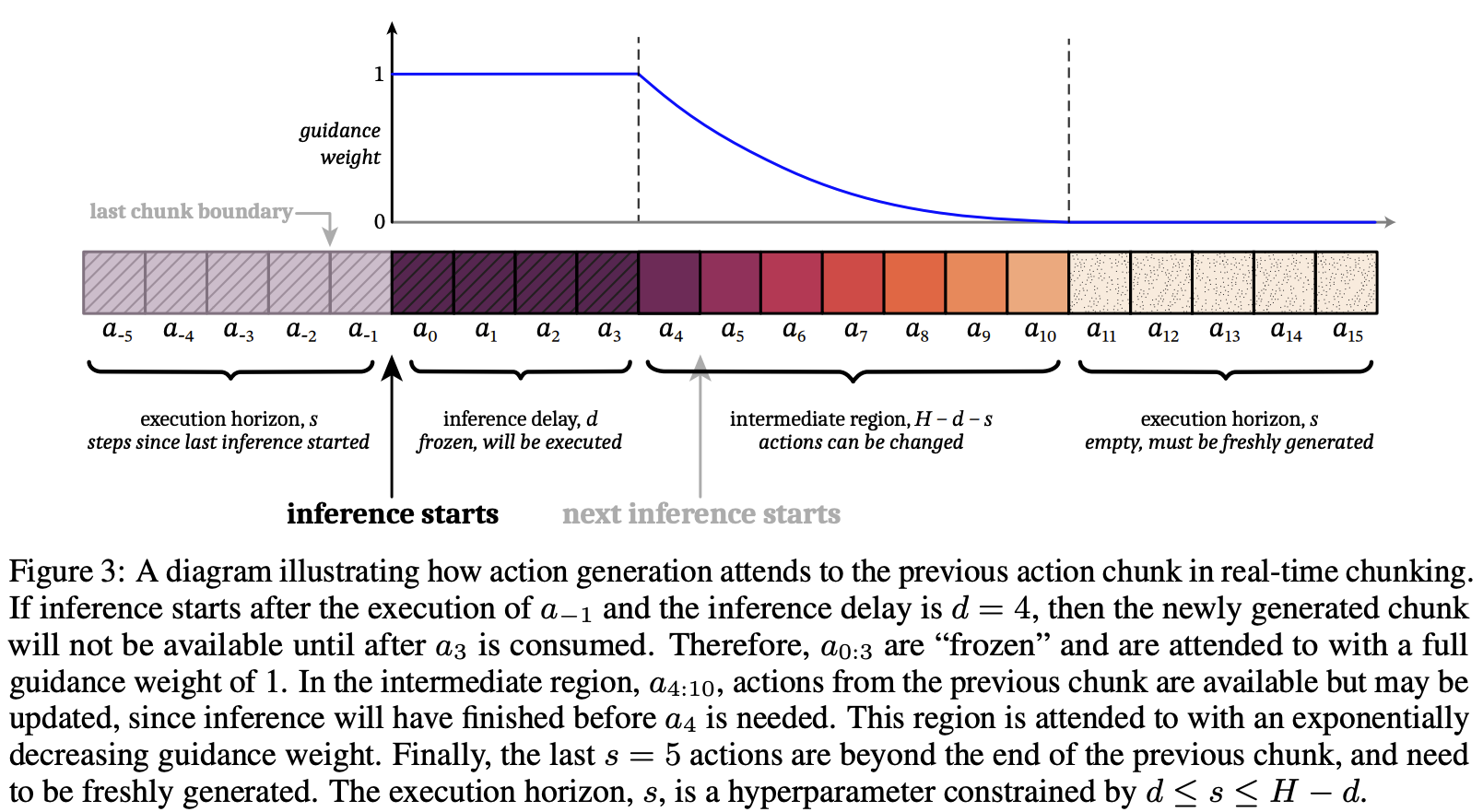 Our key insight is to pose real-time chunking as an inpainting problem. To make the new chunk “compatible”, we must use the overlapping timesteps where we have access to the remaining actions of the previous chunk. The first d actions from the new chunk cannot be used, since those timesteps will have already passed by the time the new chunk becomes available. Thus, it makes sense to “freeze” those actions to the values that we know will be executed; our goal is then to fill in the remainder of the new chunk in a way that is consistent with this frozen prefix (see Figure 3), much like inpainting a section of an image that has been removed