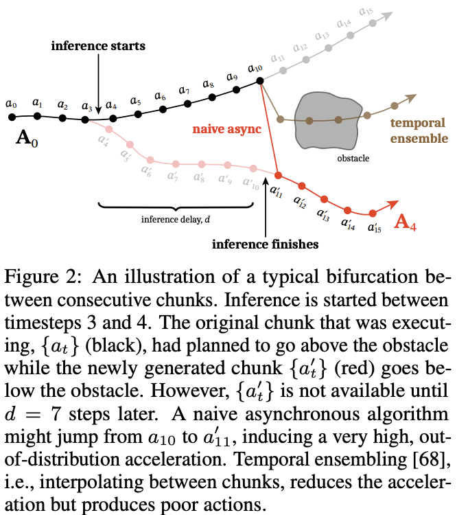 So in task execution / motion planning the system my predict future actions (execution horizon). Only get executed (execution horizon). The paper studies what’s the best way to make this action chunking work in the face of inference latency.
