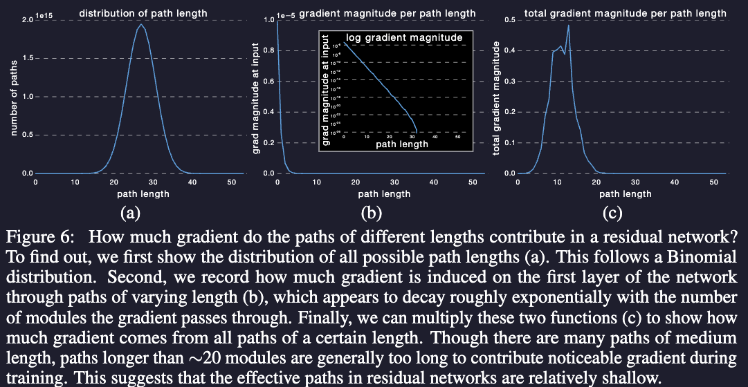 The effective paths in residual networks are relatively shallow Surprisingly, almost all of the gradient updates during training come from paths between 5 and 17 modules long. These are the effective paths, even though they constitute only 0.45% of all paths through this network. Moreover, in comparison to the total length of the network, the effective paths are relatively shallow.