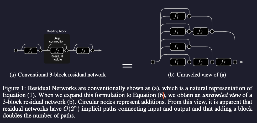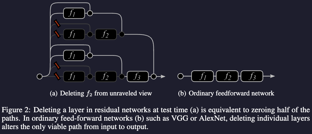 This can explain why we can delete layers from ResNet and the performance is not decreased much (we are just reducing the number of paths), why this property cannot hold for more traditional networks. We can even reorder the modules.