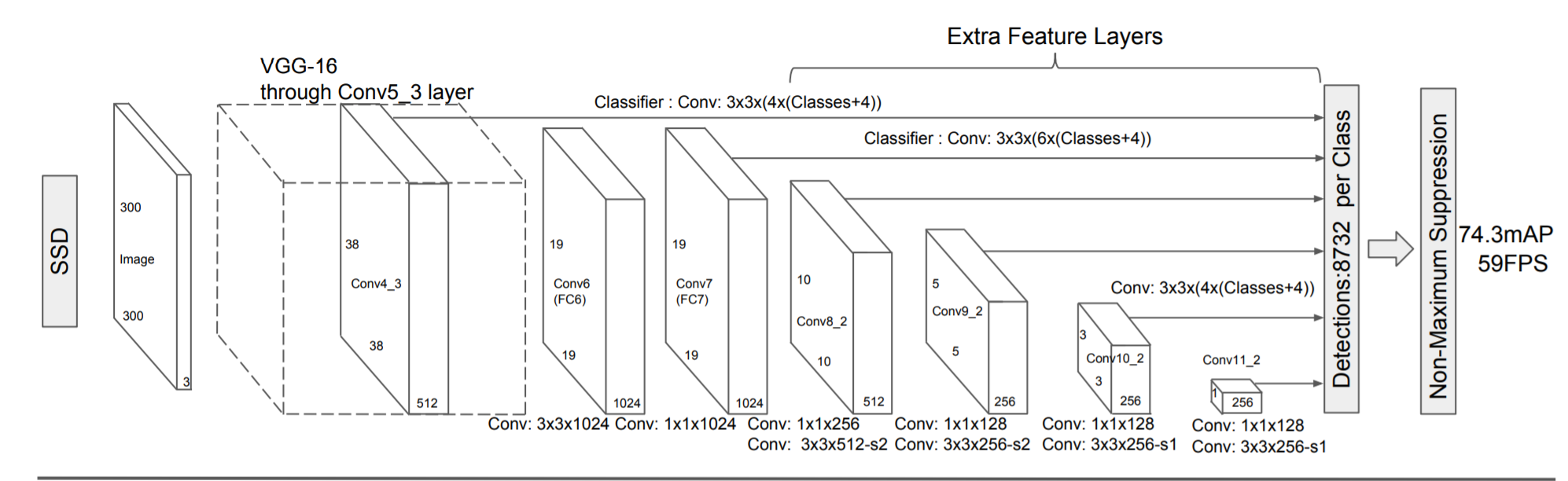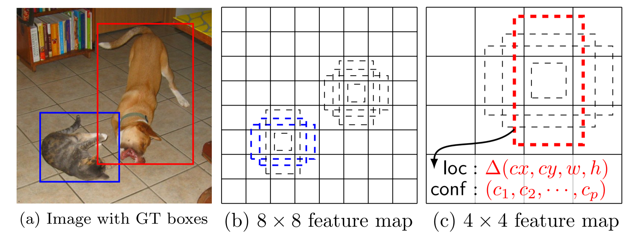 Generate a bunch of boxes to look at at different scale. For each of them, output class confidence + offset to the shape of the default box. Compute the loss by matching each box with ground truth box and do regression.