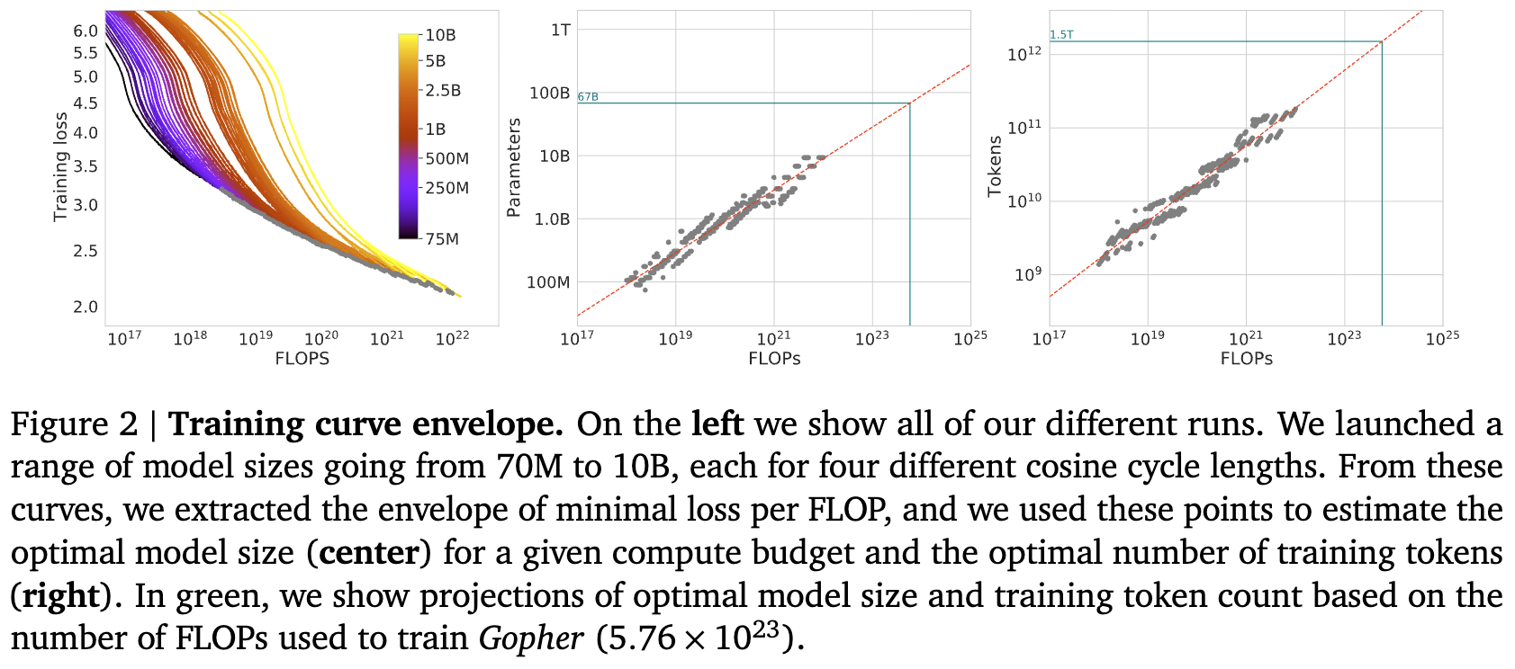 A single training run traces a trajectory through FLOP space. A 1B model trained for 100B tokens passes through on its way to . Method 1 reuses these intermediate checkpoints as data points at multiple FLOP budgets. The complication is that a model “passing through” a FLOP budget mid-training has an LR schedule tuned for a different endpoint — hence the 4 different decay schedules per model size to partially address this.