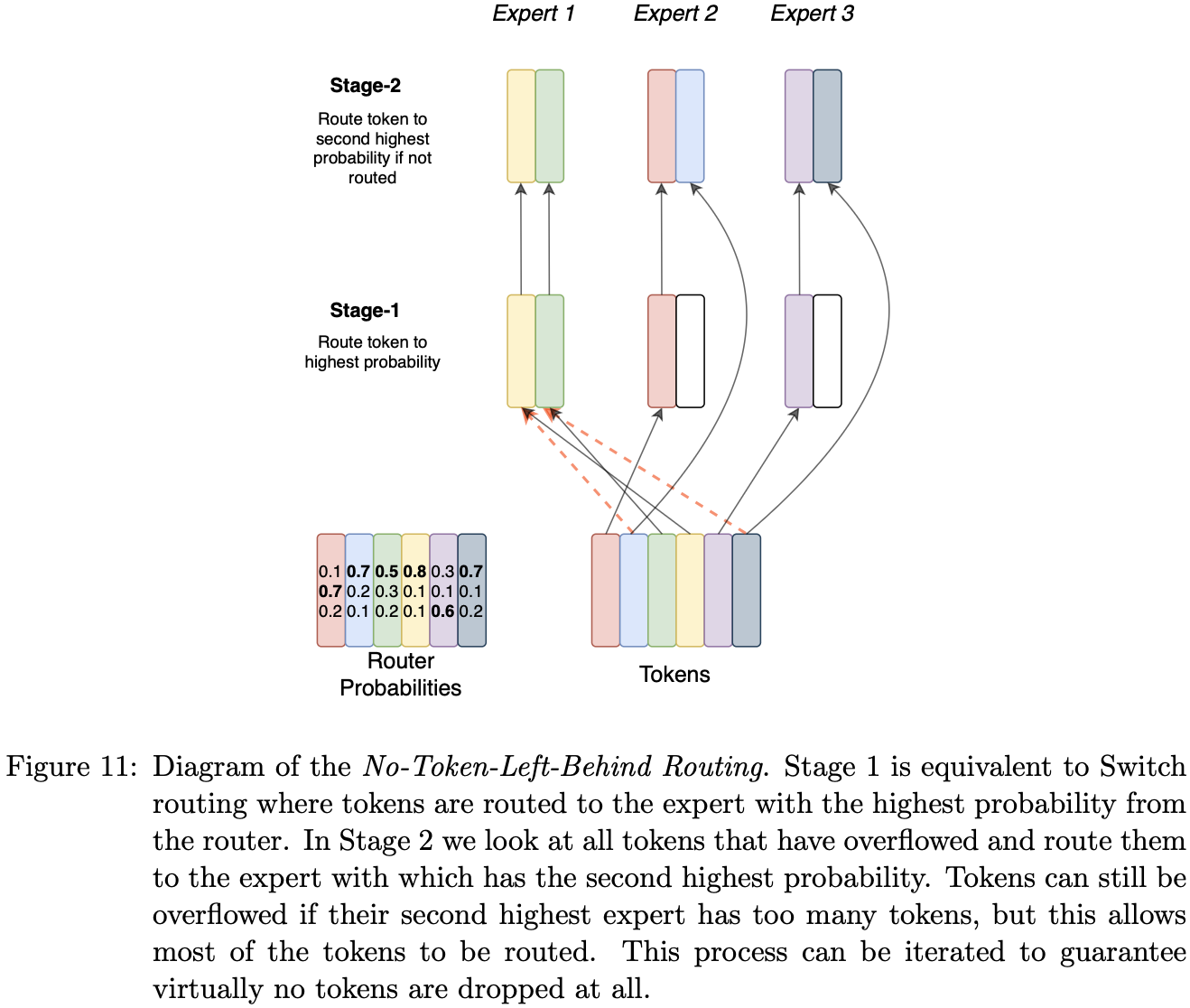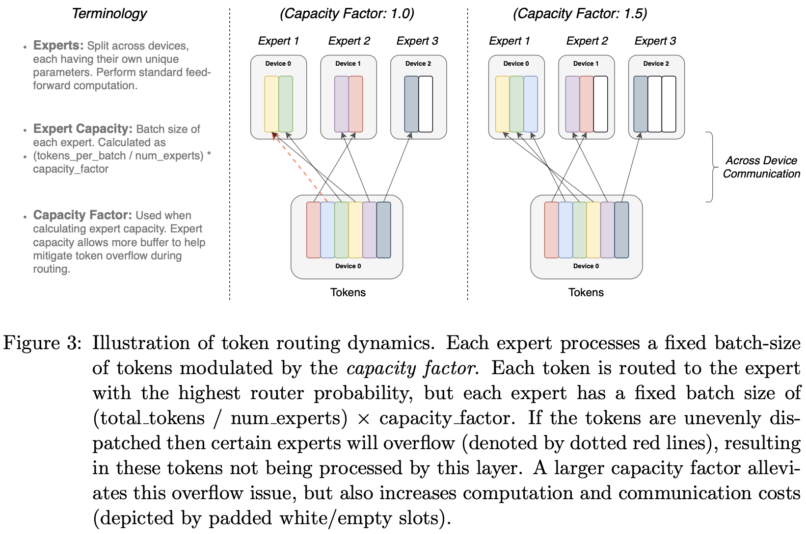 If too many tokens are routed to an expert (referred to later as dropped tokens), computation is skipped and the token representation is passed directly to the next layer through the residual connection.