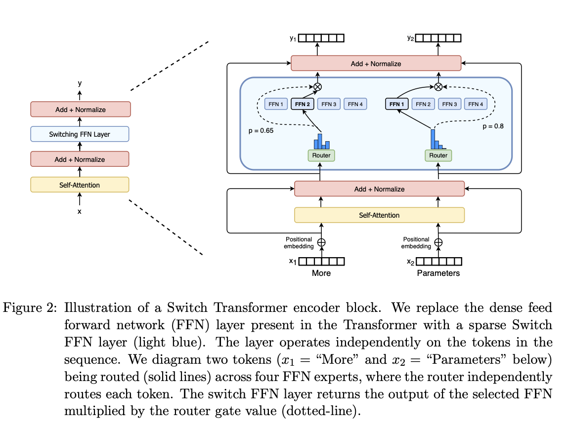 Recall in the vanilla MoE, k experts are picked and the results are added together. Here the author argue a single expert is enough.That’s where the name “switch” comes from. The reaons