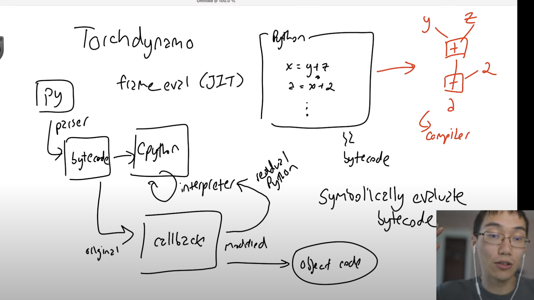 In CPython’s C API, one is allowed to set a frame handler for Python functions. That frame means function frame here, so all the stack information. So Torch Dynamo basically does a cached compilation of the code (an Python bytecode interpreter inside Python, symbolically interpreting the code), converting original opcodes into a FX Graph. Specifically, we pay special attention to Torch tensors, so they are put into a graph and can be compiled.