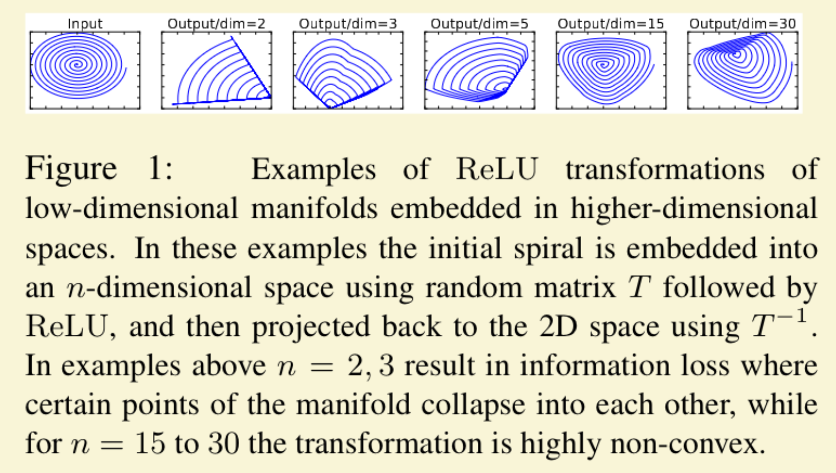 Consider the case for ReLU, which in space leads to piece linear curve with n-joints, and thus we got information lost. Here in the image we can see some data is just collapsed in low dim. On higher dim this is fine, since now the manifold is only a small part of the input space.
