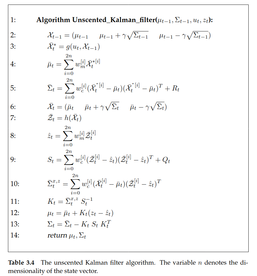 While EKF do linearization via first order Tayler expansion, this method does that by something called unscented transform. That means we sample some points around mean, see where they are at in new distribution, and fit a Gaussion on it. Recall in EKF the only thing we care about is the moments. Here it’s sampled points, thus more accurate.