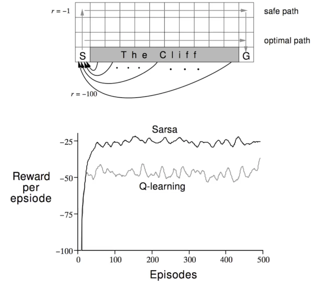 On the other hand, Q learning would stick to the optimal path, since according to its value estimation the optimal path is just the better one, since it has a larger . So it would explore that path more often and got down more often. Note the final policy may be a more optimal one.